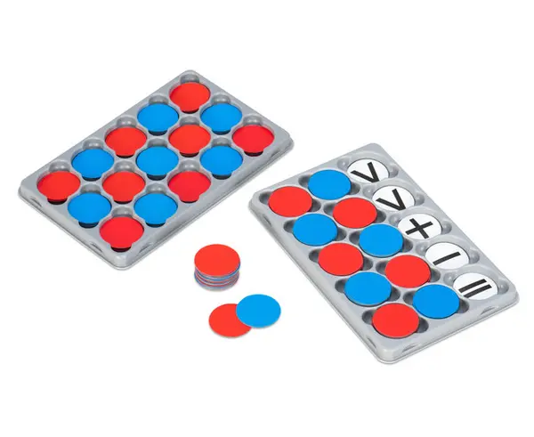 I pakken følger det med 100 tofargete brikker og 20 symboler. De 5 cm store brikkene er røde på den ene siden og blå på den andre siden. Foruten addisjon og subtraksjon, medfølger også brikker med symbolene større enn og mindre enn. Den visuelle framstillingen vil gjøre det enklere å forstå mattestykkene.