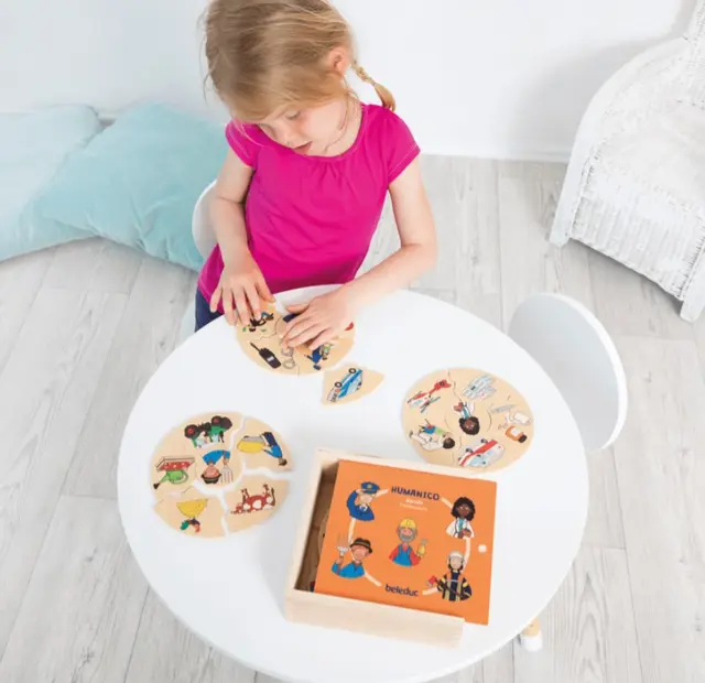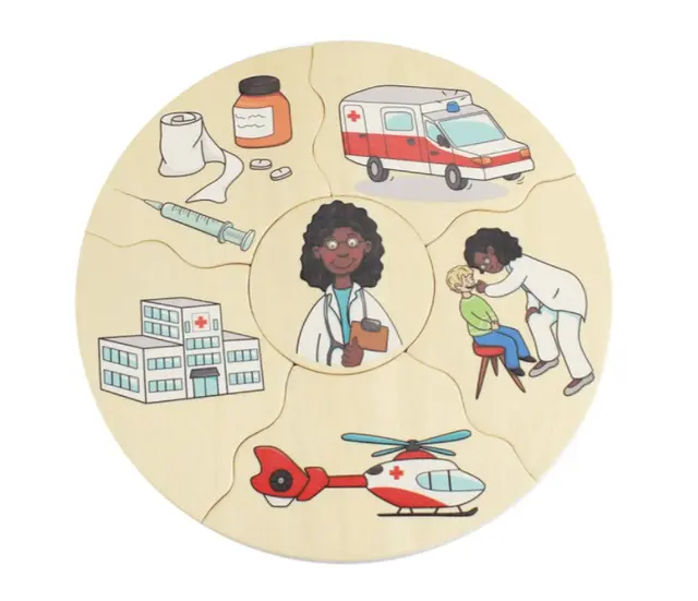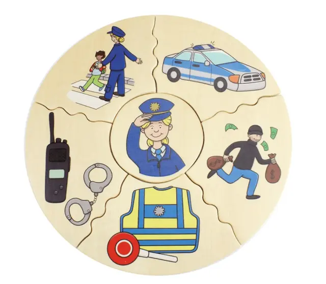 Hva gjør doktoren, bonden, brannmannen, politi og anleggsarbeideren? Fem puslespillbrikker matches til hvert av de spennende yrkene. Barna lærer på en leken måte hva de ulike yrkene driver med og hvorfor de er så viktige for oss alle.