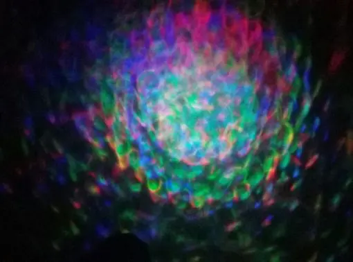Fargeprojektor til sanserommet. Projektorn skifter mellom ulike farger i ett mønster som ser ut som vann eller skyer. Med fjernkontrollen som følger med kan man velge mellom ulike hastigheter og lysstyrke, i enkeltfarge eller skiftende farger.