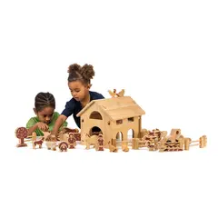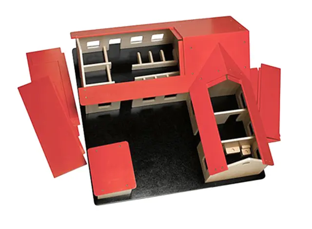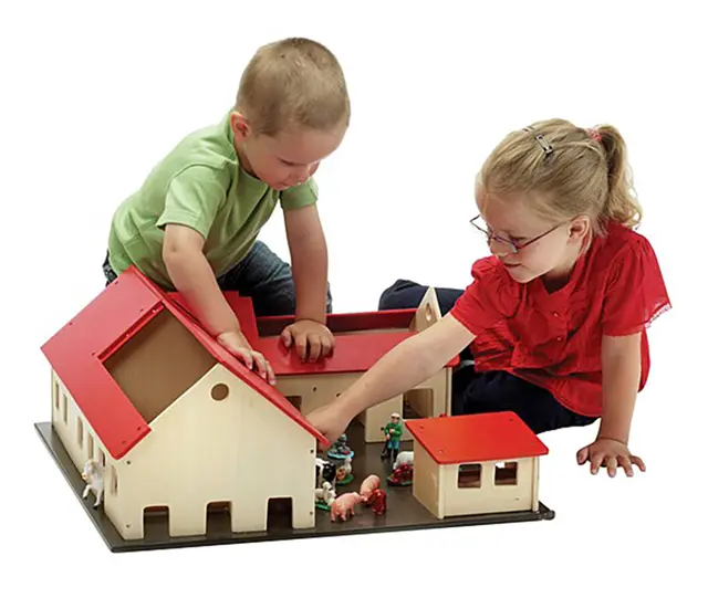 Naturbondegård med plass til dyr og maskiner. Bondegårdstaket kan åpnes. Eks. tilbehør.