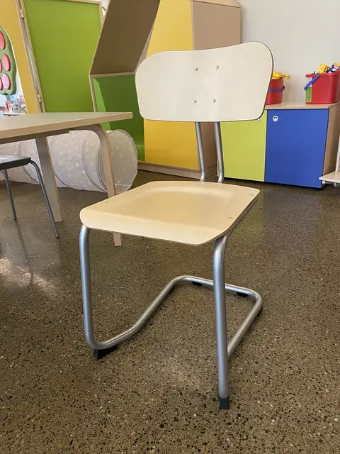 Elegant og moderne stol utført i kryssfiner med slitesterk høytrykklaminat og pulverlakkert stålmunderstell. Stolens understell gjør at den kan henges opp på bord når den ikke er i bruk. Under stolbena er det beskyttelsesklosser som gjør at den ikke vipper samtidig som den beskytter gulvet mot riper.