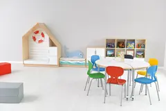 Elevstol i friske farger i pulverlakkert metall og plastskall. Sete og rygg er støpt som en helhet, noe som gjør at en lett fjærende ryggen tilpasser seg naturlig den enkeltes rygg. Understellet på stolen har en utforming i C fasong som gjør den enkel å henge opp på bord når den ikke er i bruk.