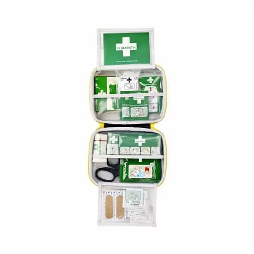 Innhold: 1 Cederroth 4-in-1 Blodstopper, 1 Cederroth 4-in-1 mini Blodstopper, 10 Salvequick Plaster, 6 Salvequick Sårvask, 4 Salvequick Maxi Cover, 1 Pustemaske, 2 Safety Hand Cleanser, 2 par Hansker, 1 Redningsteppe, 1 Elastisk bandasje, 1 Cederroth Burn Gel Dressing, 1 Saks, 1 Førstehjelpsinstruksjon.