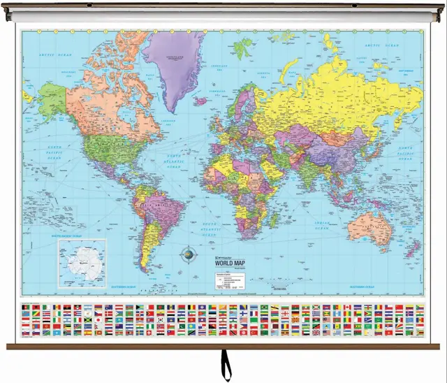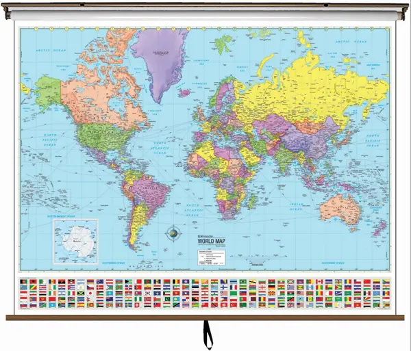 Klasseromkart som inneholder et vell av verdifull informasjon, inkludert kontinenter, individuelle landegrenser, hovedsteder, større byer og vannveier, og de siste internasjonale navneendringene. Disse fargerike kartene er laget med lesbarhet i tankene, og fremhever den politiske verden, med detaljert kartografi, så vel som flaggene til de fleste nasjoner. Kommer montert på selvløftende stokk og med fester.