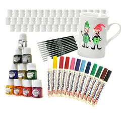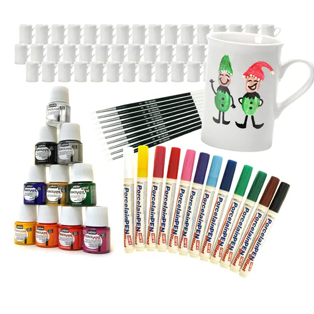 Her får du alt du trenger når du vil male på glass og porselen! En morsom aktivitet både for barn og voksne. Pakken inneholder 10 krukker med porselensmaling, 10 pensler, 48 hvite porselenskrus og 12 porselenspenner.