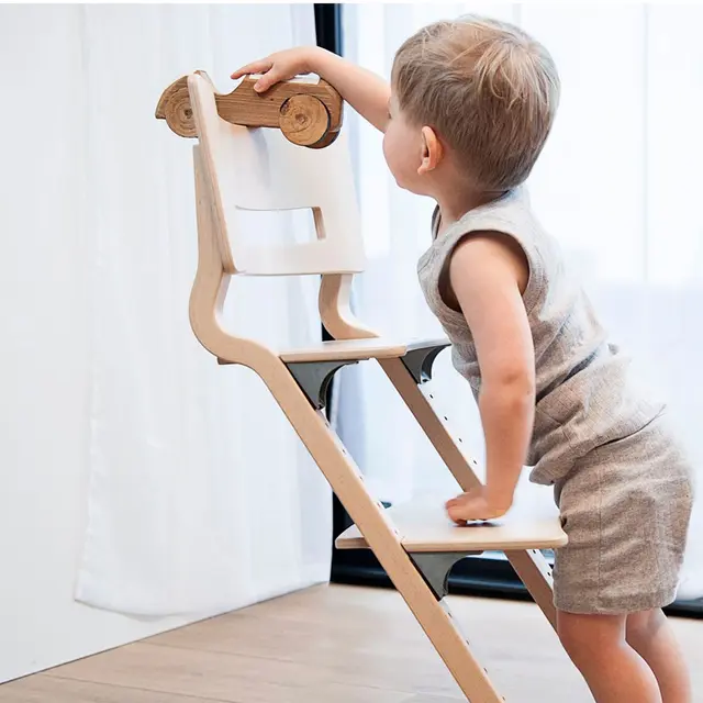 Stilren og klassisk høystol i bøk fra Leander. Stolen har justerbar rygg, sete og fotplate, som gjør at barnet sitter i en god, ergonomisk positur. Med sine runde former, gir den barnet god støtte fra alle kanter. De formspente lange bena gjør at stolen ikke tipper og at den står stødige. De gir også stolen en lettfjærende effekt slik at stolen beveger seg i takt med barnet. Stolen og tilbehør er testet og godkjent i henhold til sikkerhetsstandard EN14988 for høye barnestoler. Leander-stolen har en maksvekt på 125 kg.