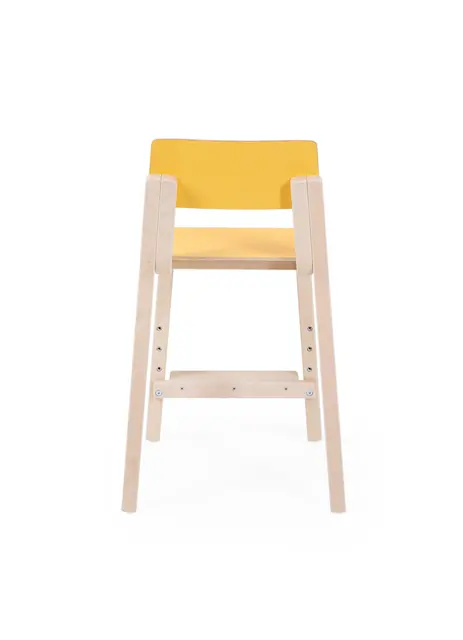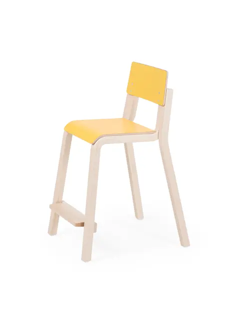 Stablebar høystol utført i kryssfiner av bjerk med slitesterk laminat på sete og rygg. Stolen leveres med fotbrett som kan justeres til 4 ulike høyder og tilpasses barnas høyde. Stolen har avrundede hjørner og leveres med solide beskyttelsesknotter i plast under stolbena så man unngår riper på gulv. Stolens sittehøyde passer til bordhøyde 72 cm.