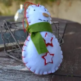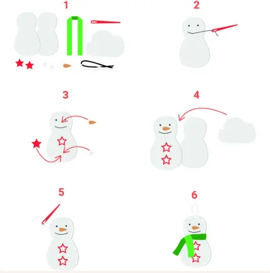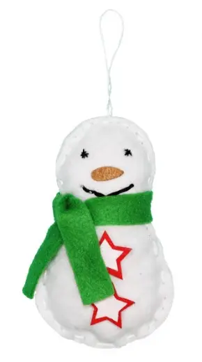 Innehold: Materiale til 10 snømenn; 20 ferdigkuttede snømenn deler, filt stjerner, skjerf, nese, fyllvatt, tråd og nål.
