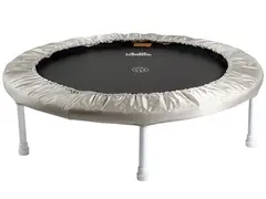 Spesial-terapi-trampoline med sikkerhets- håndgrep. Stillbar i 6 forskjellige høyder. Kan derfor brukes av barn og voksne. Duken er festet med 36 stk. sterke stålfjærer. Fjærene er festet i spesialhylser på rammen for optimal holdbarhet. Trampolinen tåler belastning helt opp til 120 kg.