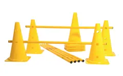 Skap aktive og morsomme treningsøkter med dette multisettet. Består av 12 stk kjegler (H40 cm) og 6 stk staver som kan justeres i tre høyder. Bruk som del av hinderløype eller motorikkbaner.