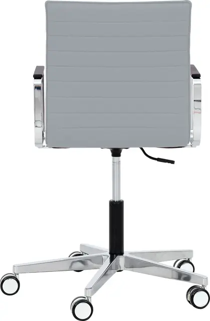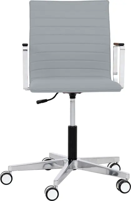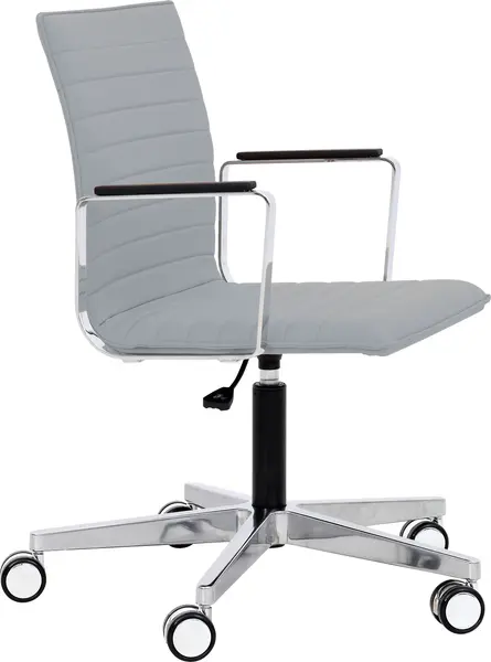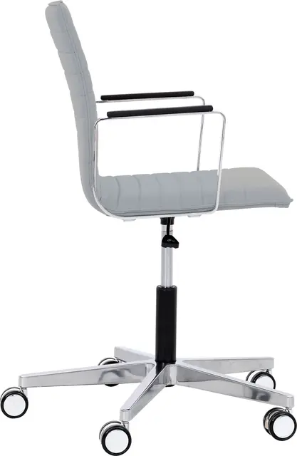 Materiale: Polert aluminiumsramme (kromeffekt) med høydejustering, på kromhjul, kromarmstøtter med skinnbekledning.