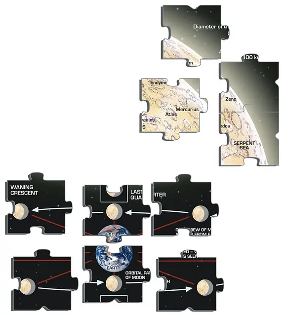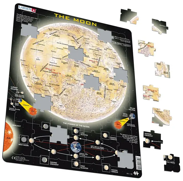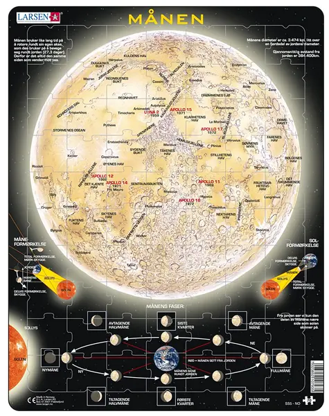 Puslespill - månen med navn på de ulike formasjoner. Viser også hvordan måner ser ut fra jorda, nymåne, fullmåne osv.