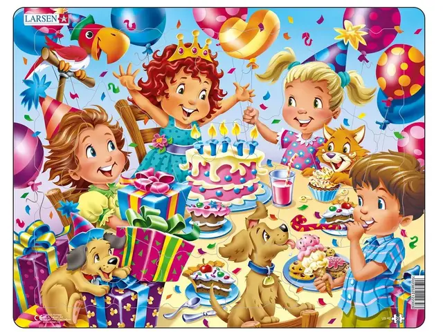 Ingenting er vel morsommere enn et bursdagsselskap! Puslespill med brikker som er formet som en bamse, krone, rulleskøyte, skateboard, kake, cupcake m.m