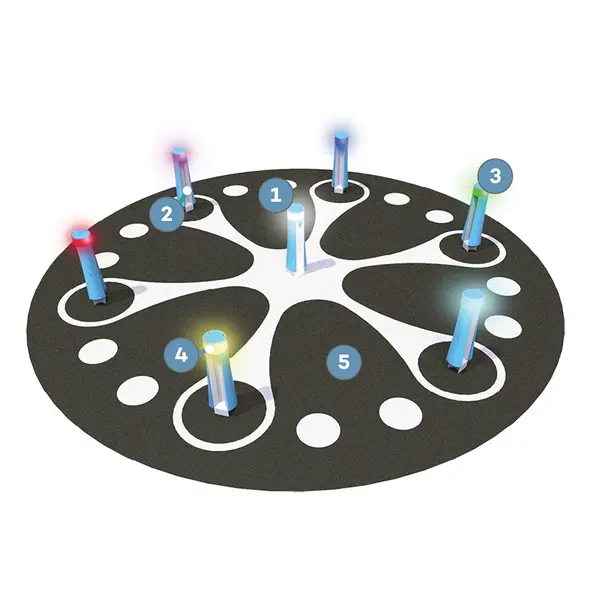 Syv stolper med hver sin 360° LED berøringsskjerm kombinerer det beste av digitale spill med fysisk utfoldelse. Barn og unge lokkes til lek i bevegelse, og det blir garantert fart på feltet. Klasserommet kan flyttes utendørs, innholdet er alltid oppdatert, og systemet er motstandsdyktig mot både uvær, slitasje og hærverk.