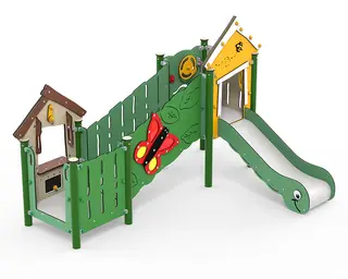 Stort lekemiljø for de minste barna med butikk, balansebro og sklie. Se verden gjennom et helt nytt perspektiv gjennom sommerfuglens fargede vinger som lyser opp når sola skinner!
