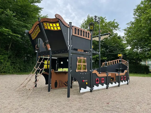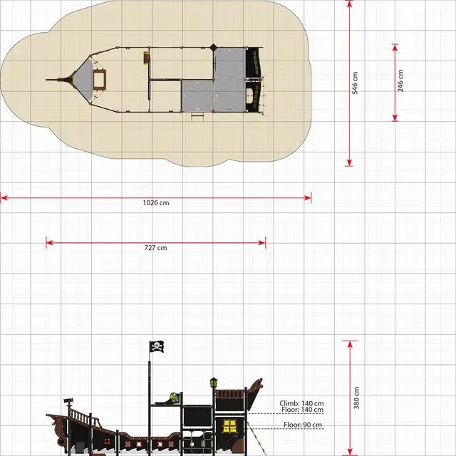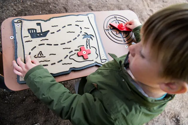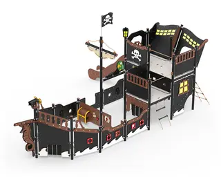 Aktiviteter: Taustige, nett, plattformer, skattekiste, mast med seil, kabin, bevegelige deler, vinduer, ror, kikkert