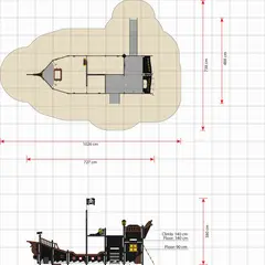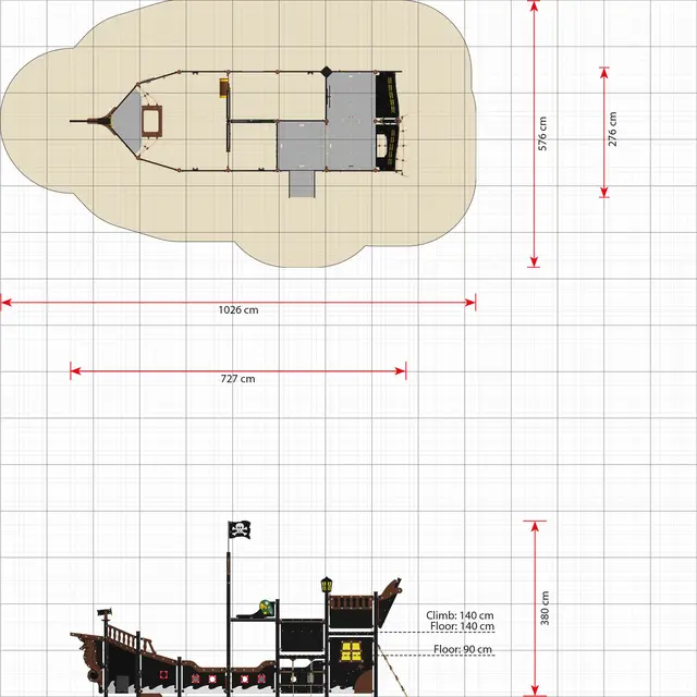 Aktiviteter: Trapp, nett, plattformer, skattekiste, mast med seil, kabin, bevegelige deler, vinduer, ror, kikkert