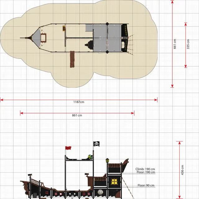 Aktiviteter: Trapp, nett, kryperør, planke med fjær, plattformer, skattekiste, mast med seil, kabin, bevegelige deler, vinduer, ror, kikkert