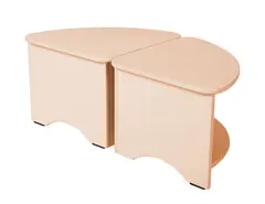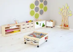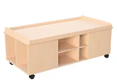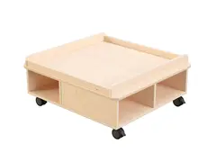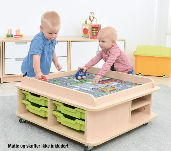 Bord utført i laminat med farge lys lønn. Plass til oppbevaringskasser under bordplaten. Hyller for oppbevaring av matter og leker.