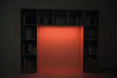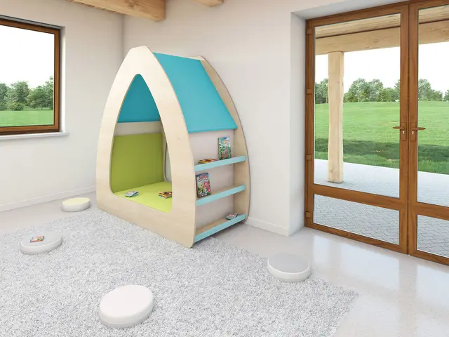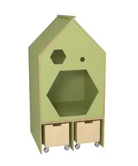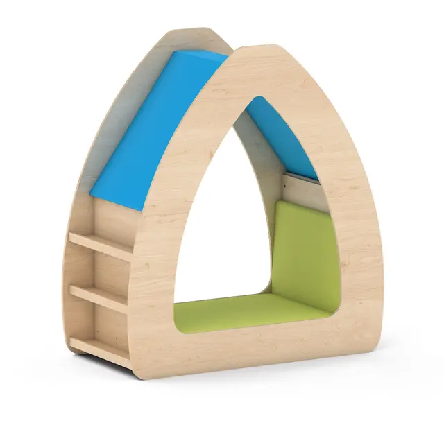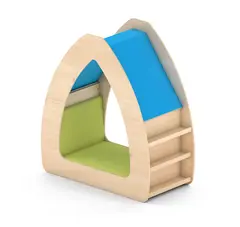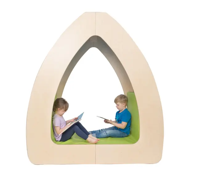 Hyggelig lesekrok utført i kryssfiner av bjerk. Med plass til oppbevaring av bøker på begge sidene. Leveres komplett med madrass og stofftak.