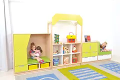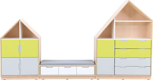 Møbelsett bestående av to husformede oppbevaringsmoduler og en oppbevaringsbenk. Settet leveres komplett som avbildet med tilsammen syv skuffer, seks skap, åpne hyller og sittebenk med grå madrass. Gir godt med lagringsplass og tilfører rommet en leken atmosfære.