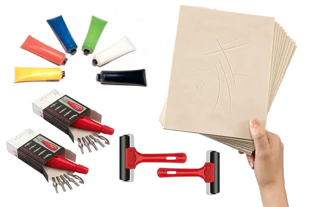 Et startsett bestående av 6 grunnleggende produkter du trenger for å få glede av trykking med lino. Inneholder: Plater (10 stk 15 x 10 cm, 10 stk 20 x 15 cm, 10 stk 30 x 20 cm), trykkfarger 6 flasker x 250 ml, linorull 1 st, linokniv med 10 utbyttbare knivblader.