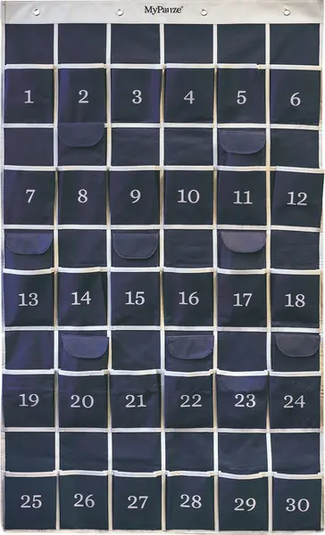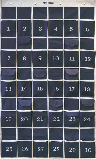 Hotellets oppbevaringsrom er nummerert fra 1–30 og har 4 metallringer for enkel oppheng. Laget av slitesterkt polyesterstoff i mørkeblått.