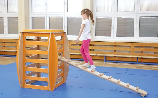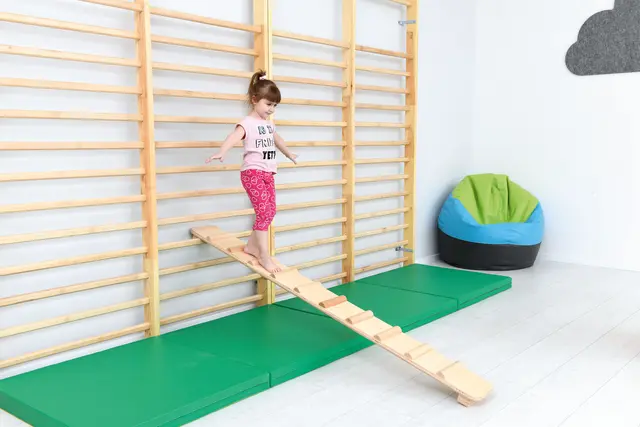 Balansebom på 2 meter som kombineres med gymnastikkubene, varenummer 30663 og 30664. Laget av kryssfiner av bjerk. Overflate er utformet med stigetrinn. Leveres også med tre andre overflater som gir ulike utfordringer og sensoriske opplevelser. Passer til ribbevegger.