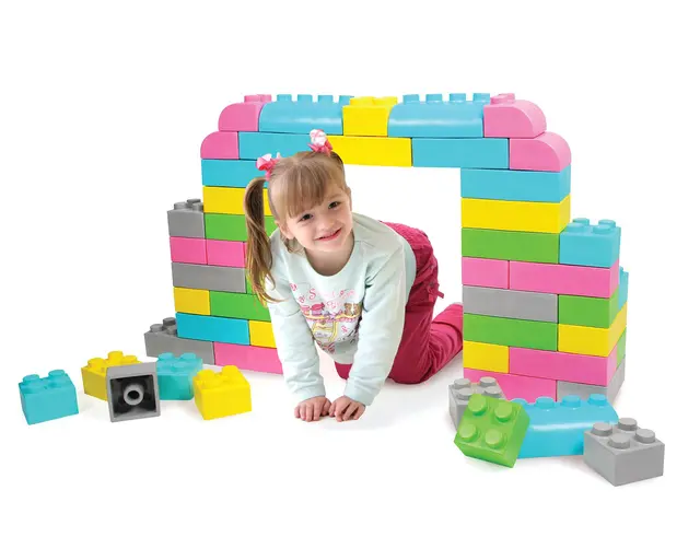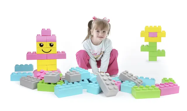 Store, myke blokker i to forskjellige fargevalg; pastell- og primærfarger. Laget av slitesterkt skum, kan brukes både inne og ute og kan også vaskes. Fri for Ftalater og andre farlige stoffer.
