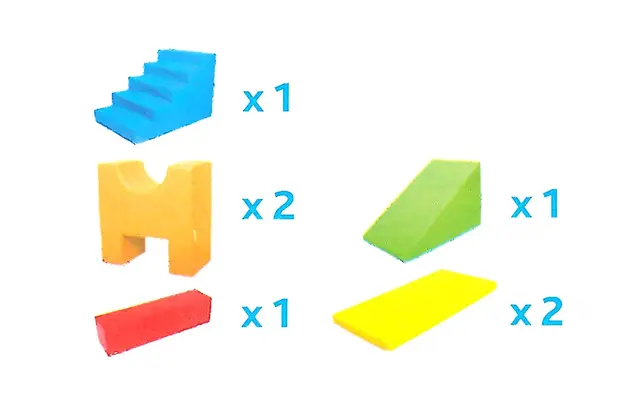 Byggesett Asterix i skum 7 deler. Inneholder delene trapp x 1, H-element x 2, bjelke x 1, sklie x 1, liten madrass x 2. Størrelse på hele settet: 240 x 300 cm.