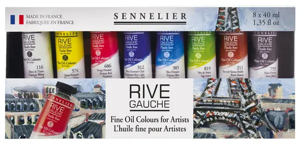 Sennelier sin oljemaling Rive Gauche er oljemaling på kunst nivå med pigmenter som er knust en gang. Rive Gauche tørker 2 ganger raskere enn andre oljemalinger, gulner minder og har ikke kadmium.
