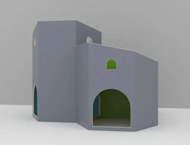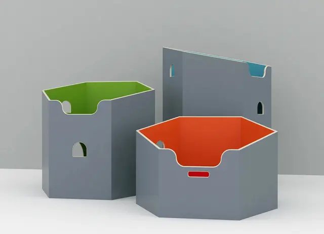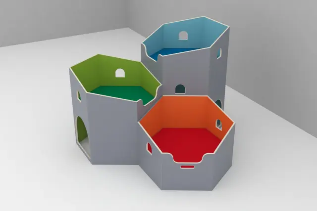 Hexa borg sett 3 moduler i 15 mm bjerkefiner med utvendig grå laminat og farge orange , grønn og turkis innvendig og puter , madrasser følger med i samme farge. Modulene kan stå samlet eller hver for seg for å lage et spennende og fleksibelt lekemiljø.