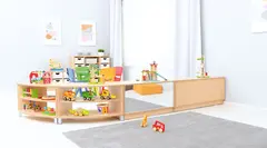 Åpen reol for oversiktlig oppbevaring av bøker, leker eller formingsmateriell. Reolen kan tilpasses med brede skuffer og små eller store dører for å møte ulike lagringsbehov.
