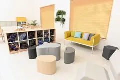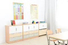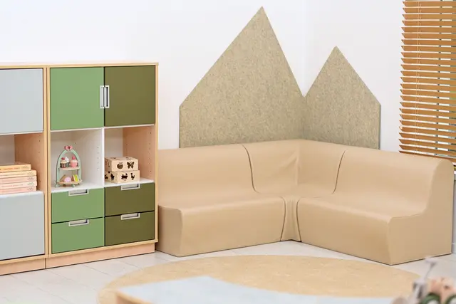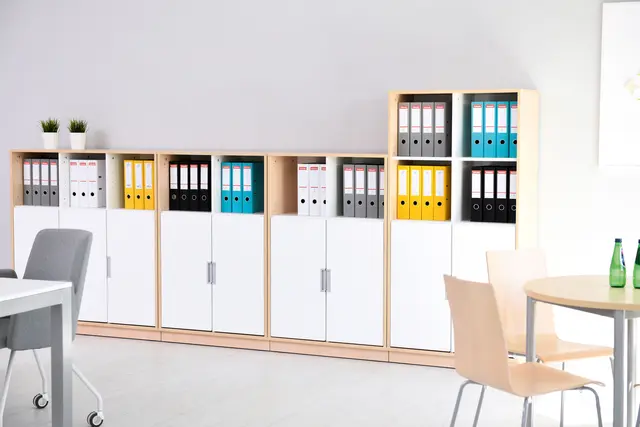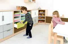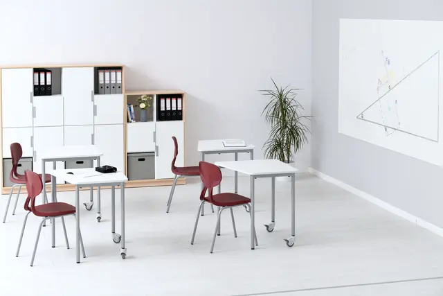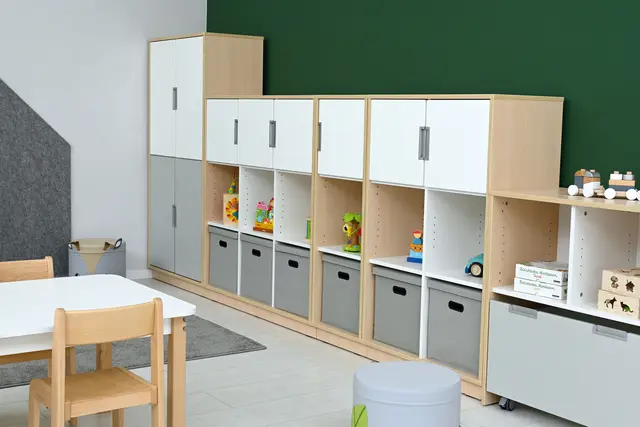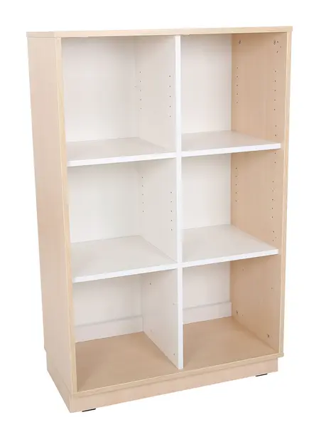Fleksibel reol for oppbevaring med to hylleplan og en skillevegg. Reolen er designet spesielt med tanke på utdanningsmiljø, og kan enkelt tilpasses de ulike behovene man har for oppbevaring. Tilvalg inkluderer ekstra hyller, små eller store dører og smale skuffer.