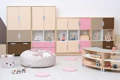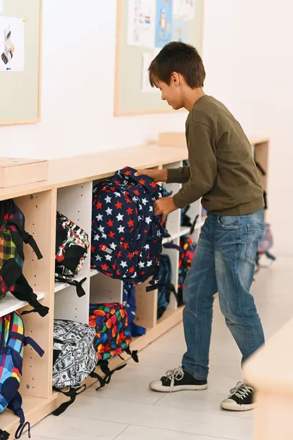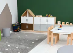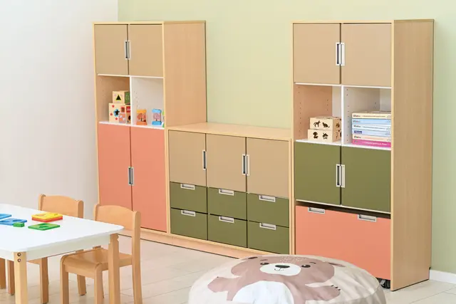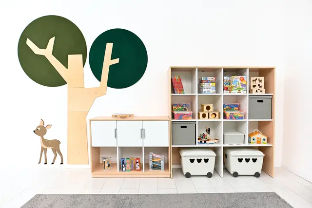 Fleksibel reol for oppbevaring med et hylleplan og to skillevegger. Reolen er designet spesielt med tanke på utdanningsmiljø, og kan enkelt tilpasses ulike behov med ekstra hyller, små eller store dører eller smale skuffer.