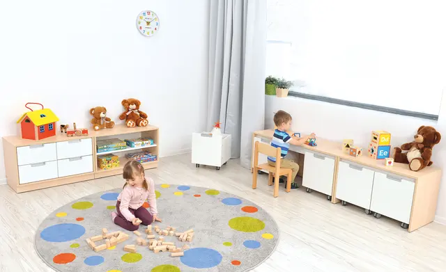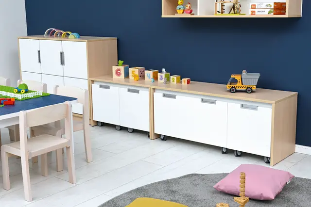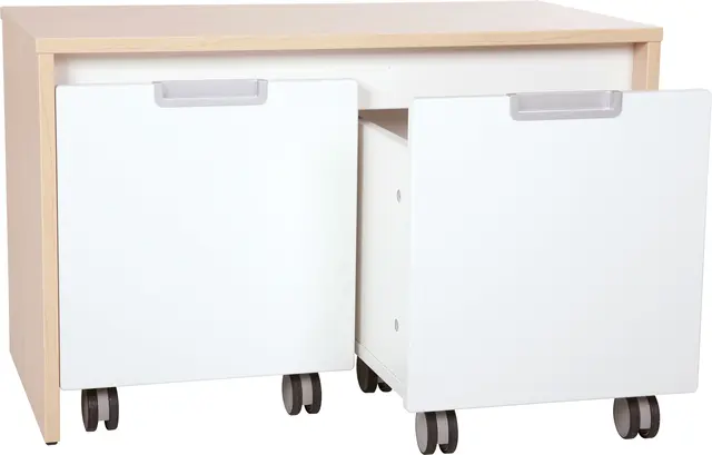 Praktisk benk med plass til en stor eller to små oppbevaringskasser. En super oppbevaringsløsning for barnehagen, der leker og klosser er lett tilgjengelig for barna. Kassene selges separat.
