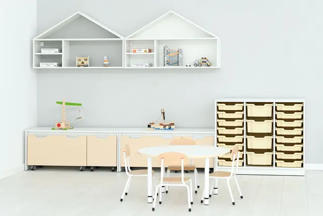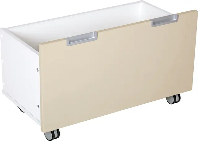 Romslig oppbevaringskasse med hjul, finnes i et bredt utvalg farger. Praktisk oppbevaring for byggesett, klosser eller lekedyr. Enkel å flytte og lett tilgjengelig for barna. Se varenummer 30464 og 30465 for tilhørende benker, bestilles separat.