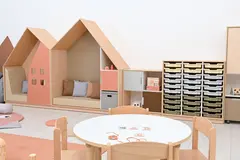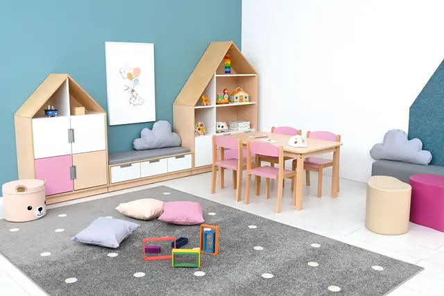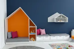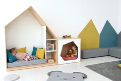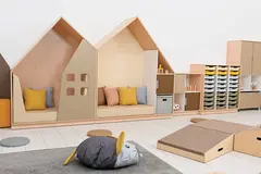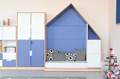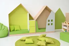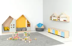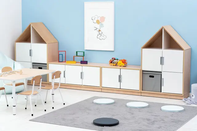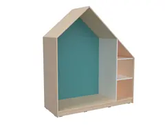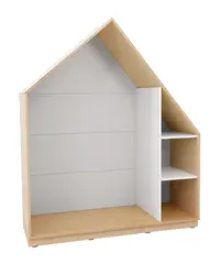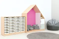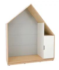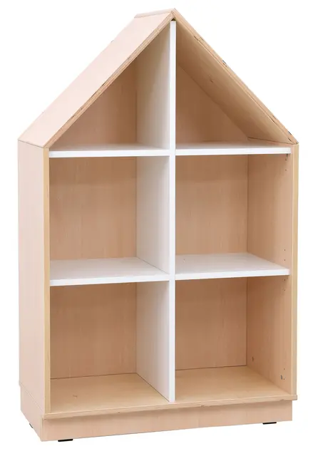 Leken og praktisk oppbevaringsløning formet som et hus. Utført i 18 mm møbelspon i farge lys lønn. Modulen kan kombineres med små eller store dører i mange ulike farger, og gir mulighet for tilpasning etter behov og designønsker.