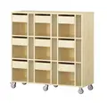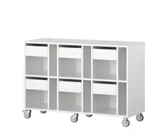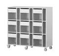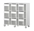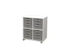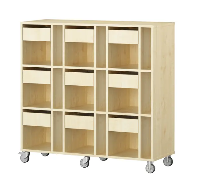 Mobil elevreol med plass til oppbevaring av skolesaker og bøker til 9 elever. Oppbevaringsreolen er utført i 18 mm tykk møbelspon med direktelaminat og er tilgjengelig i hvit, grå og bjørk farge. Reolen leveres med lettrullede hjul, hvorav 2 er låsbare. Skuffene leveres med softclose mekanisme.