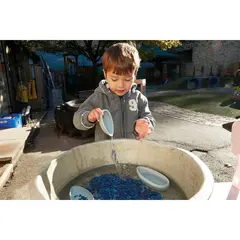 Settet består av vannslanger i klar plast, trakt, flasker, diverse målebeger og måleskjeer. Alt en trenger til vannlek og eksperimentering.
