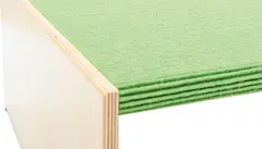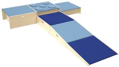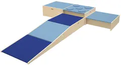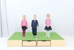 Lekepodiesett utført i lakkert kryssfiner med Tretford teppe på topplate. Tretfor teppet består av en blanding av ull fra sau og geit og er et godt miljvennlig valg. Settet består av ulike deler som kan settes samme ut i fra eget ønske og plass i rommet. Modul med vindu er laget med sikkerhetsglass som kan gåes og leker på.