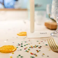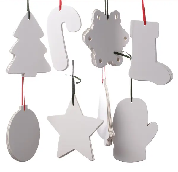 Julemotiv i solid hvit papp med hull for å henge opp eller som kan brukes som etiketter. Inneholder juletre, snøfnugg, bjelle, julestrømpe, vott, polkastang, julekule og stjerne.