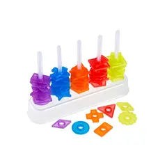 Innhold: Trestativ (L16.8 x B6.3 cm), 30 treringer, 1 tallterning, 1 fargeterning, instruksjoner, magnetisk oppbevaringsboks (L23 x B12 x H6 cm)