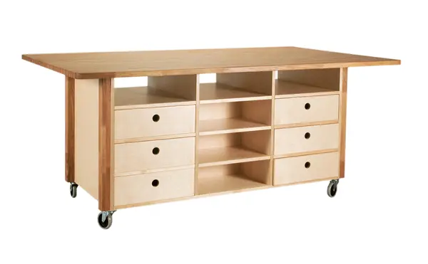 Mobilt arbeidsbord med plate i eik. Stamme i bjørkefinér med seks treskuffer og seks åpne rom på hver langside, for oppbevaring av arbeidet, verktøy og annet material. Fem hjul hvorav to er låsbare. Platens overheng gjør det mulig å sitte på høye stoler rundt bordet.