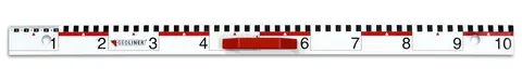 1 meter lang tavlelinjal med håndtak. Linjalen er delt inn i cm og dm.