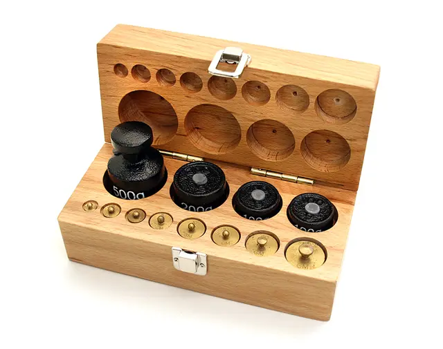 Jernloddene kommer i: 1 x 500g, 1 x 200g og 2 x 100g. Messingloddene kommer i: 1 x 50g, 1 x 20g, 2 x 10g, 1 x 5g, 2 x 2g, 1 x 1g.