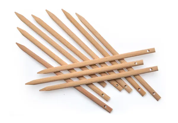 Vevenål i tre, avrundet form og med en spissere tupp, for veving med garn.